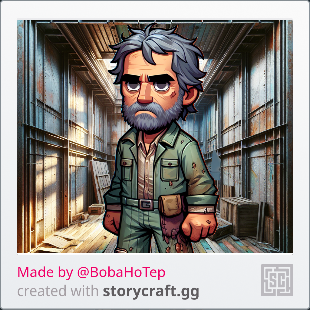 Elias Rennick is a melancholic figure in a post-apocalyptic wasteland. He spends his days meticulously scooping up skeletons and disposing of bodies. He carries with him a haunting sense of loss but finds a grim sense of purpose in his work. Elias is known for his attention to detail and his quiet, methodical approach to the grim tasks at hand.