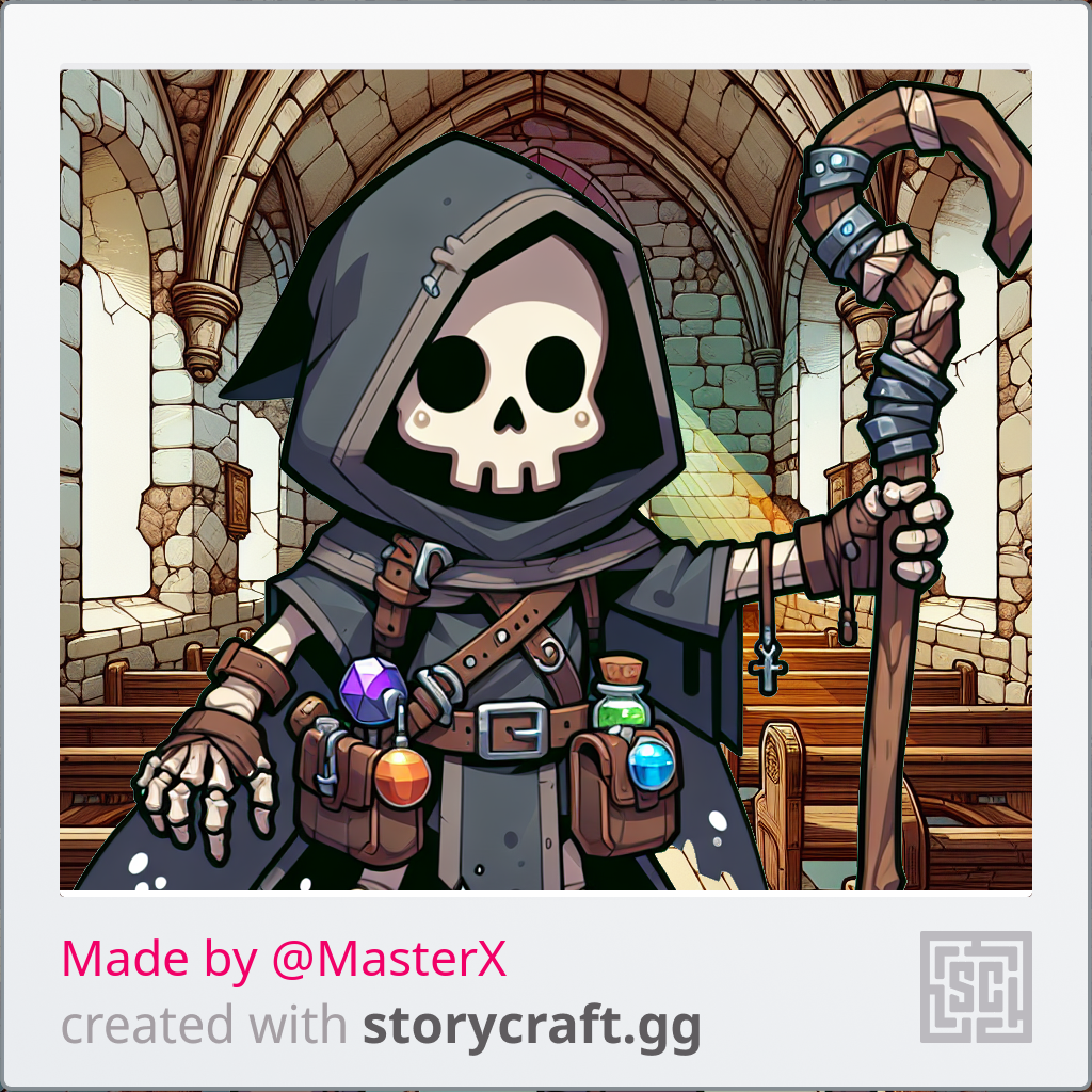 Grimzky is a socially awkward but surprisingly compassionate undead cleric. Known for his sarcastic remarks, he often uses his undead appearance and dark humor to mask the weight of his cursed existence as an immortal.