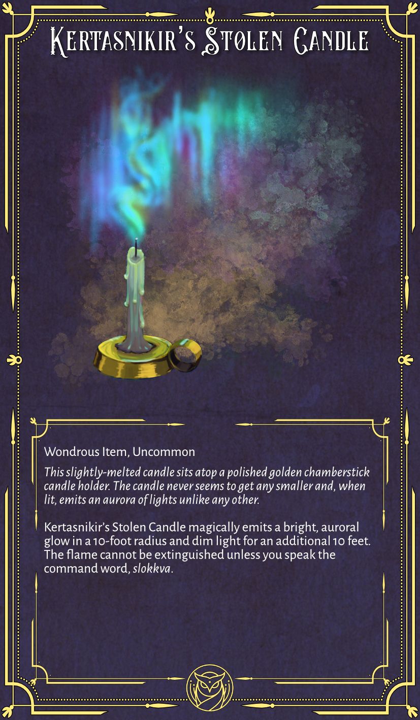 As the players huddle up in their cabin, the storms billowing outside, the door slams open. A stranger wearing a white wolven cloak enters and introduces themselves as the queen's herald. The herald relays the true scope of the danger and offers great rewards if they can help their deposed queen. The herald also bears a viable path through the storm - knowledge of the region and Kertasnikir's magic candle.