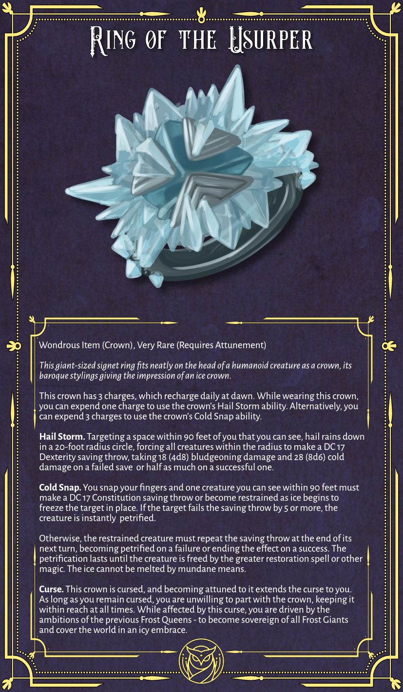 - The Usurper - Some foreign power has taken the throne. They wear the Ring of the Usurper, a crown of great magic now cursed by their evil soul.