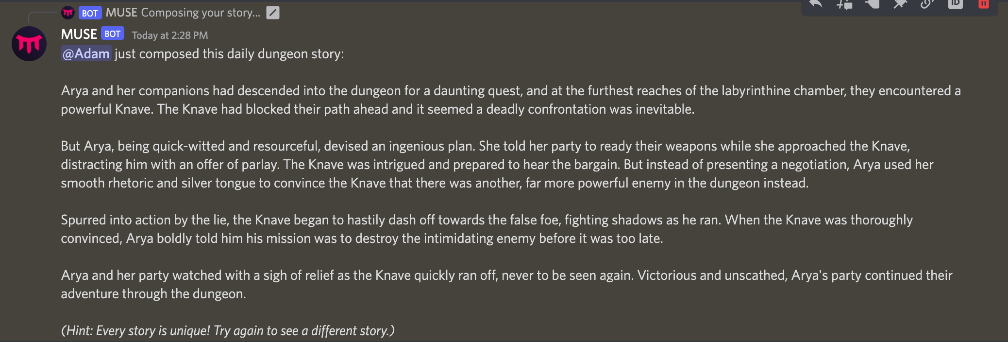 The bot knows that Arya played the Daily Dungeon against the Knave on December 13 and that she won, so it incorporates that into the story.